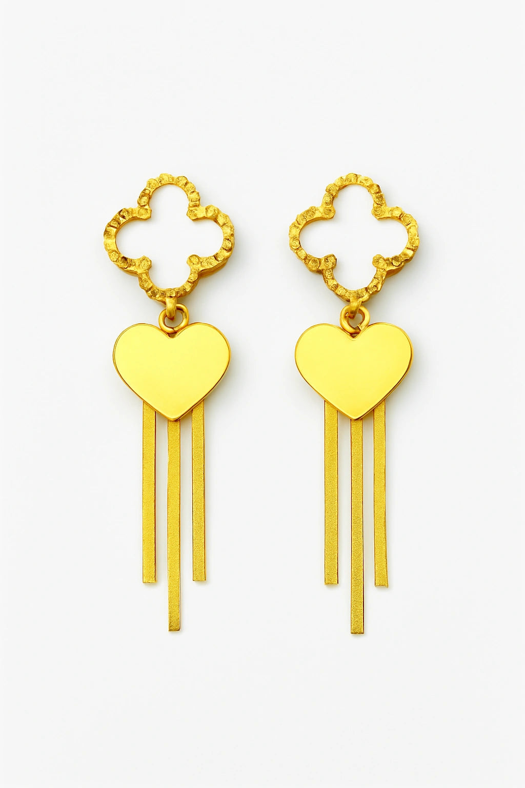 Gold Quatrefoil Heart Tassel Drop Earrings