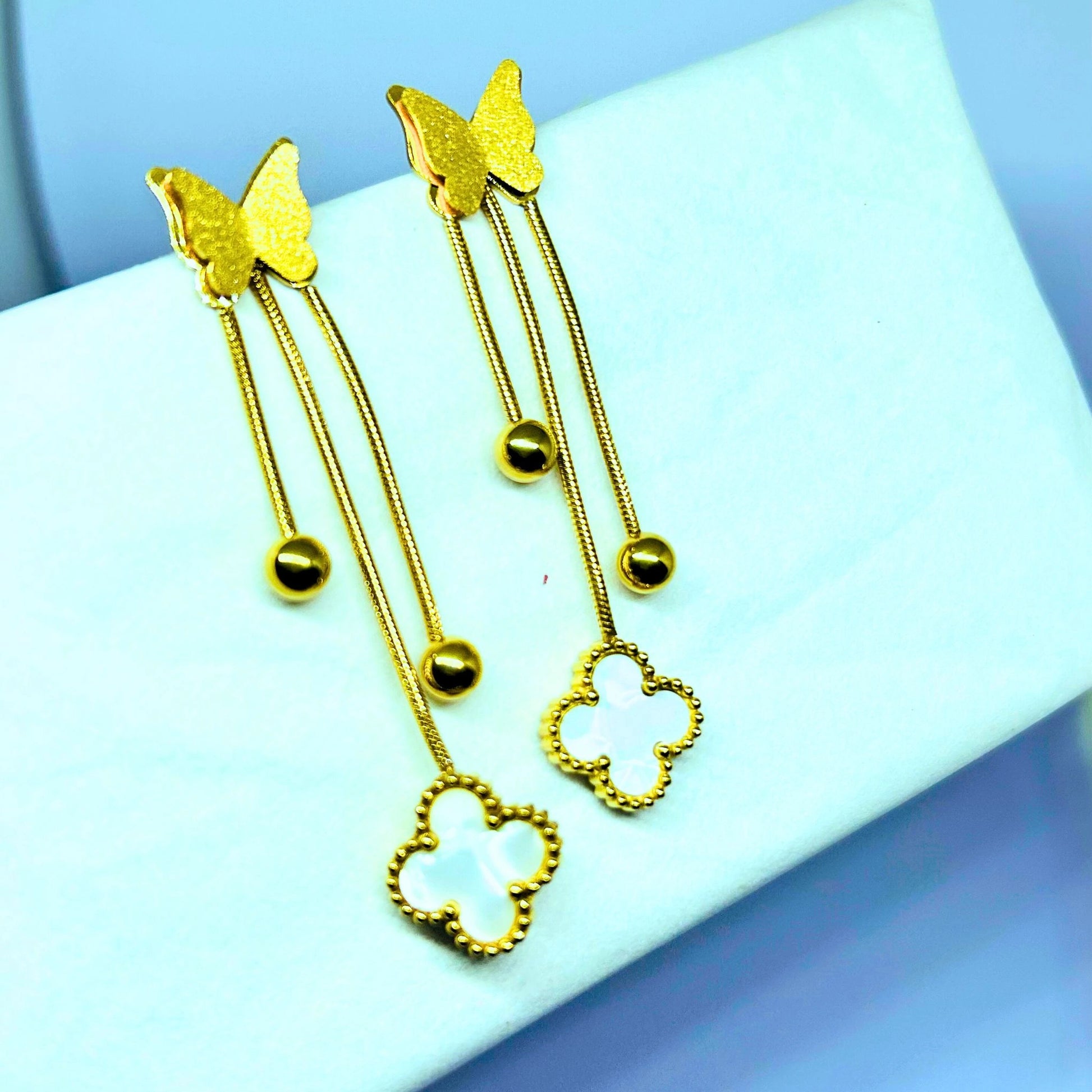 Elevate your style with these enchanting gold-tone earrings that combine delicate butterfly motifs with elegant mother of pearl accents. Each earring features cascading chains adorned with polished beads and terminated with a beautiful four-leaf clover charm in lustrous mother of pearl.